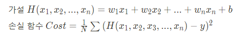 #선형회귀와 가설(Hyphothesis), 손실함수(Cost function, loss function)