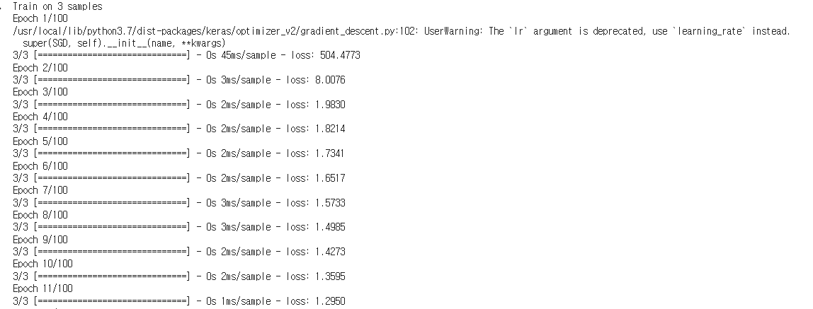model.fit(x_data, y_data, epochs=100) # epochs 복수형으로 쓰기!