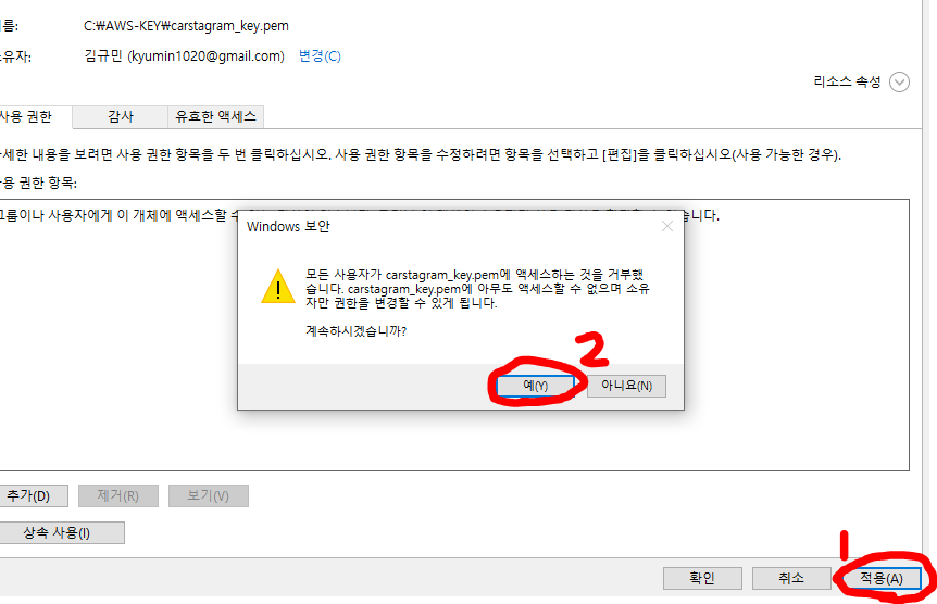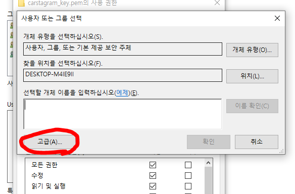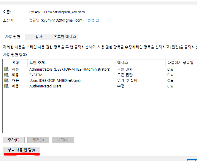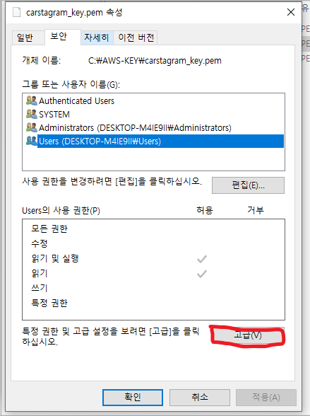 이제 .pem 파일에서 권한을 수정해주어야 한다. 먼저 .pem 파일의 속성으로 들어가서 보안을 탭의 고급을 클릭한다.