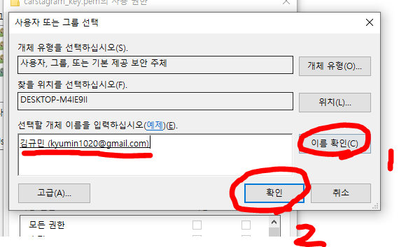 개체 이름을 현재접속한 계정으로 지정을 해주고 확인을 누른다.